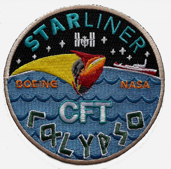 On May 6, 2024, Boeing, ULA and NASA will attempt to launch the first crewed flight of the Boeing CST-100 Starliner spacecraft. This flight is also called Boeing CFT or Boe-CFT. The crew, Butch Wilmore and Sunita Williams, have named the spacecraft "Calypso" after reknowned undersea explorer and conservationist Jacques Cousteau's ship the RV Calypso. I wanted to design a patch that celebrates the origin of the spacecraft's name. This patch depicts the Starliner Calypso on re-entry after it has departed the ISS. The patch shows the black of space and the wavy blues of the Earth's oceans. On the horizon is the original MV Calypso. The patch is 4" in diameter.