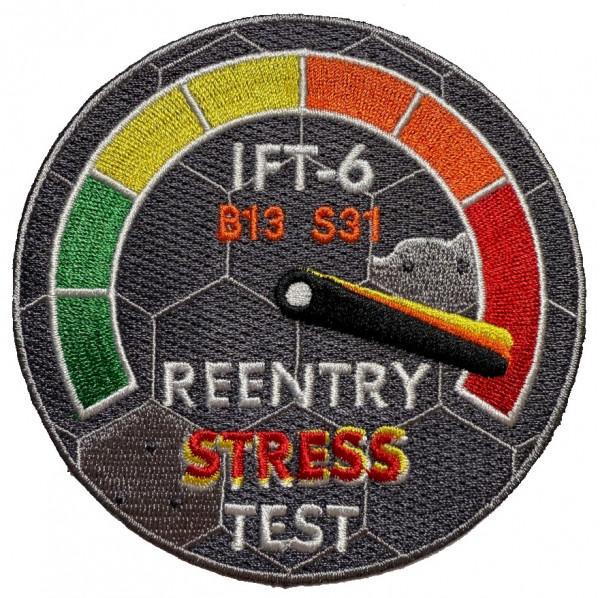 On November 19, 2024, SpaceX launched the sixth integrated flight test of the Starship Super heavy stack. The milestones of this mission were another tower catch and atmospheric reentry stress-test on the Starship spacecraft. The tower landing was aborted, but the booster and Starship landed at sea in controlled burns. The Starship used previous generation tiles and had more exposed skin areas to test their exposure to heat. This patch depicts a stress guage that is pegged out to max and shows a stylized representation of the Starship heat shields after the test with missing and broken tiles, which were expected for this flight.