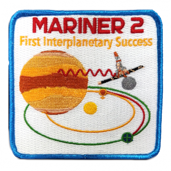This patch is a 4" patch that shows Mariner 2's flight path to Venus and depics Mariner 2 in orbit of Venus conducting experiments with its radiometer to scan Venus' atmosphere.